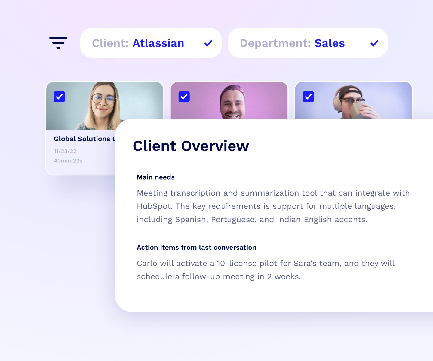 Wertvolle Zeit auf das Ansehen langweiliger Meetings verschwenden ist jetzt vorbei. Unser KI-Meeting-Assistent kann Kundenanrufe analysieren, Anfragen zu Funktionen verfolgen oder mehrere Gespräche rekapitulieren. Er liefert auch aggregierte Erkenntnisse und Trends aus Ihren Meetings, die sonst untergehen würden.