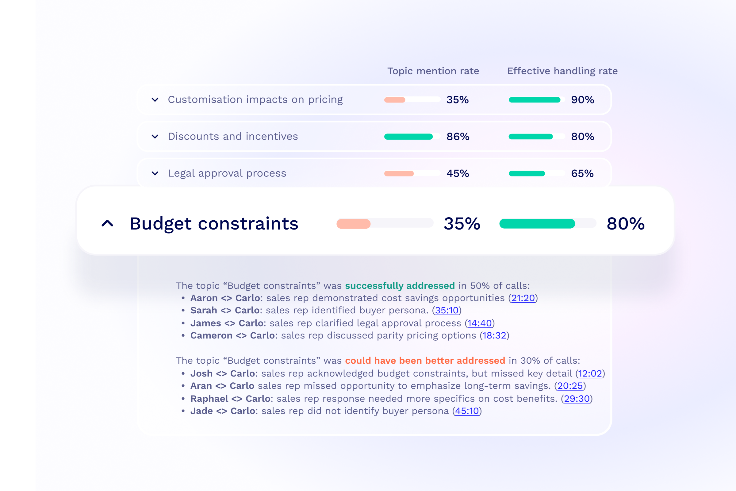 Sie können erkennen, wie Ihr Team in Hunderten von Anrufen mit den häufigsten Einwänden von Kunden umgeht. Sie sehen dadurch, wo Ihr Team gute Arbeit leistet und wo es sich verbessern kann, um mehr Aufträge abzuwickeln.