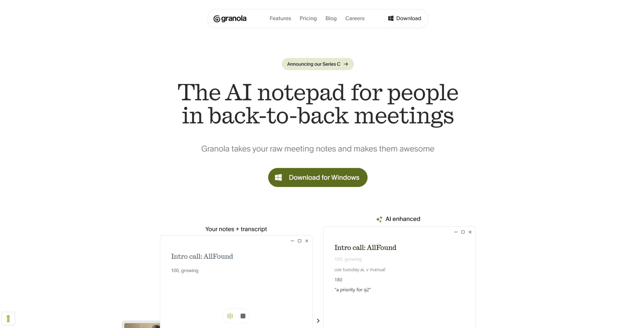 もう一つ考慮すべき点は、Granola Mac優先Granola という事実です。Androidには対応しておらず、Windows向けの機能もまだ追いついていない状況です。 また、昨日(2026年3月25日)に、Granola 15億ドルの評価額でさらに1億2500万ドルの資金 Granola 注目に値します。これは、昨年5月に調達した4300万ドルに上乗せされるものです。これは、同製品が明らかに勢いのある製品であることを示していますが、今回の資金調達ラウンドはごく最近のものであり、エンタープライズ向けの機能はまだ成熟の途上にあると言えます。