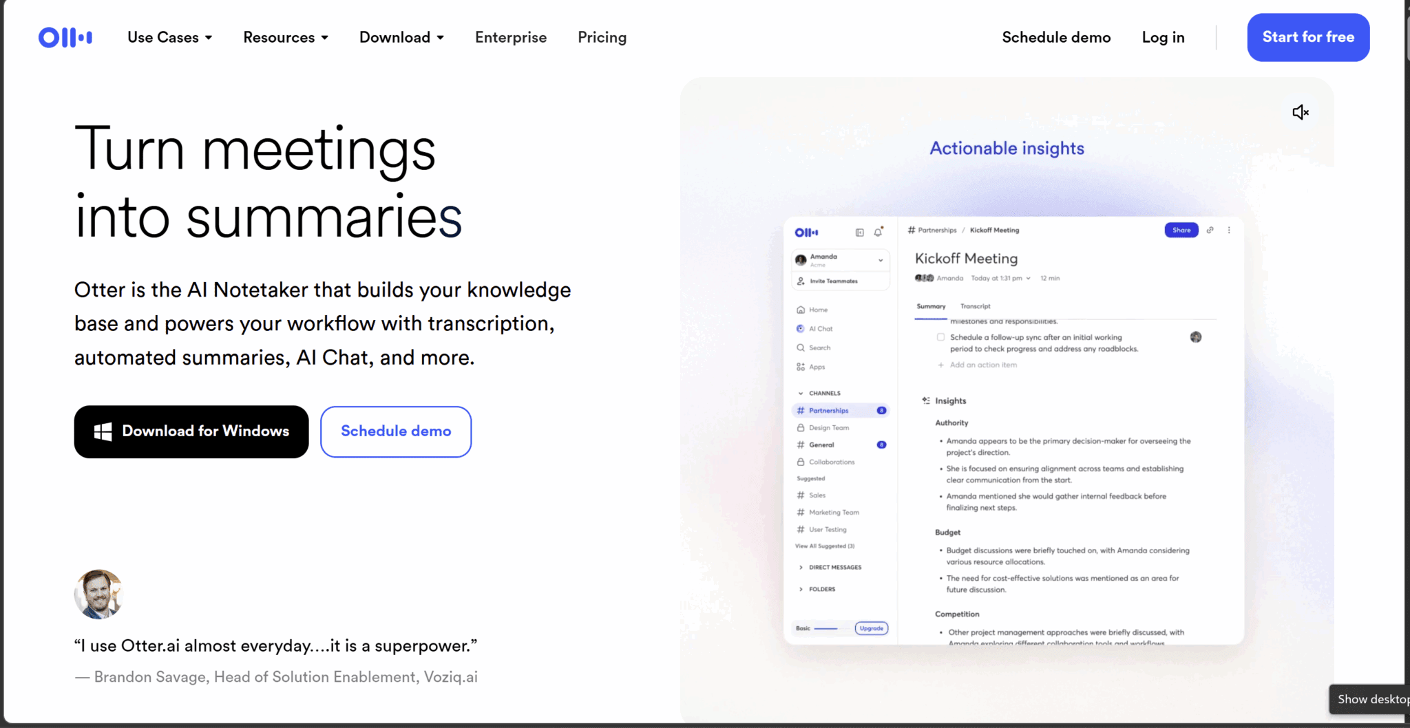 とはいえ、Otter 無視できないほど古臭さを感じる点がいくつかOtter 、特にOtter に関しては顕著です。 無料プランでは、月間300分まで、1回の会話につき30分までという制限があり、競合他社が無制限の無料文字起こしを提供している2026年においては、もはや時代遅れに感じられます。また、「OtterPilot for Sales」も依然としてエンタープライズプラン限定の機能となっています。つまり、営業チームにとって真に競争力のある機能を利用したい場合、透明性のある月額料金ではなく、カスタム契約を結ぶ必要があるということです。