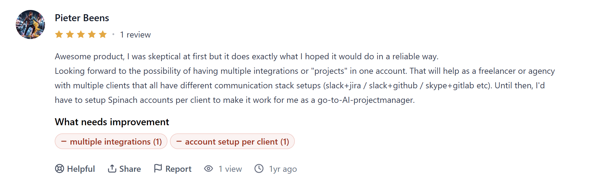 ProductHuntでは、1年前にPieter Beens氏がSpinachに5点満点の評価をつけていました。これは全プラットフォームを通じて最も新しいレビューでした。
