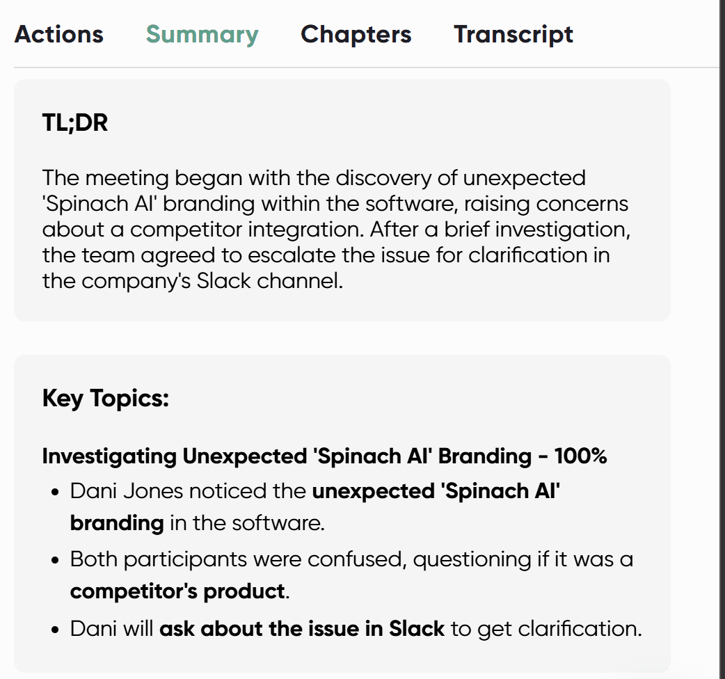 どういうわけか、Spinachは会議に参加していないようだったのに、私は会議の要約を受け取った。内容は短く、私たちが話したことの大部分は盛り込まれていなかった。そもそもどうやって記録されたのか、私にはさっぱり分からなかった。