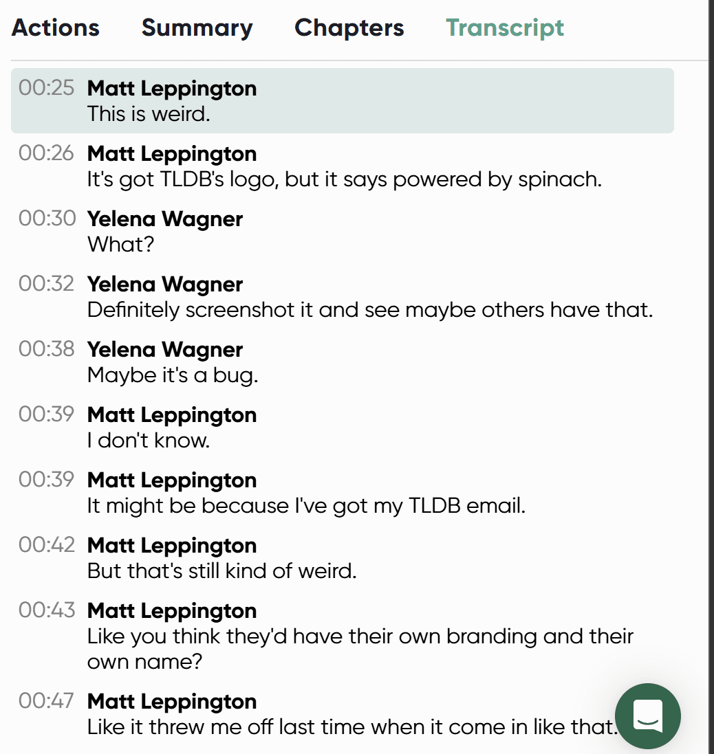 このAIチャットボットを使えば、会議終了後に会議の内容を検索することができます。これは、議事録全体をスクロールして探すことなく、3週間前に下した決定事項を素早く確認するのに便利です。単一の会議に関する検索には十分に機能しますが、「Ask Spinach」は複数の会議を一度に横断して検索することはできません。そのような複数の会議にわたる記録を検索するには、tl;dv会話分析機能を活用する必要があります。