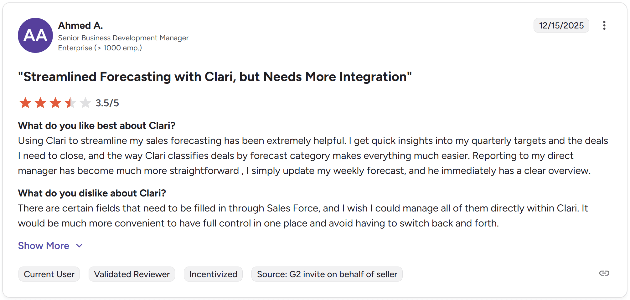 최근 G2 리뷰 중 하나에서 아메드 씨는 3.5/5점을 부여하며, 두 플랫폼 사이를 왔다 갔다 하지 않고 Clari 직접 CRM의 모든 필드를 작성할 수 있으면 좋겠다고 말했습니다.